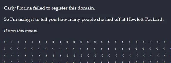 Here's a riddle: what costs $35 on Register.com (or $7 if you don't mind GoDaddy's advertising approach) but can blow a campaign launch? CarlyFiorina.org. The Republican presidential candidate and former CEO of Hewlett Packet didn't register the .org domain. Instead, someone took over the URL and posted about her layoffs at the company.