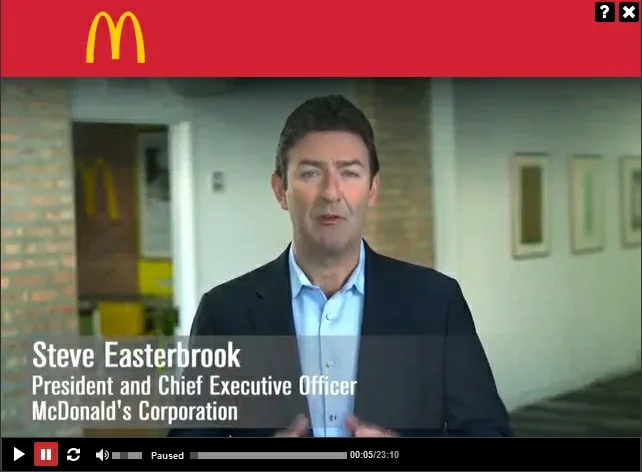 "Excitement - or emotion of any kind - was, however, conspicuously lacking from Easterbrook's even, careful speech. For 23 minutes, Easterbrook talked at the screen, staring straight ahead, rarely blinking and gesturing blandly with his hands while only occasionally raising his eyebrows for emphasis. He stood in an empty, beige McDonald's hallway decorated with generic artwork. The camera kept locked on Easterbrook's face, only breaking away to show a gray slide deck with numbers from time to time."