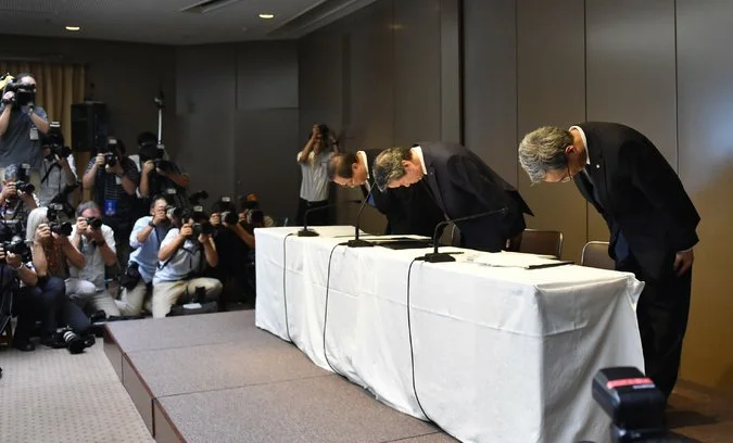 In the Japanese culture, it is traditional to bow deeply, particularly when admitting wrongdoing. Tanaka also said, "The responsibility lies in the management, including myself. As a response, I am stepping down from the post as the CEO and president."