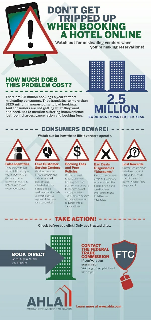 According to the American Hotel & Lodging Association (AH&LA), 2.5 million bookings-$220 million-are going to rogue sites. Users who book through these sites may find that they don't have a reservation when they get to a hotel, they may be charged large fees, or they may get misinformation about rates or cancellation policies.