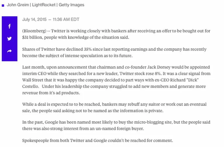 A fake story that Bloomberg is buying Twitter sent shares up 8.5% at one point. The news came from the website bloomberg.market-not the real bloomberg.com-with the title "Twitter attracts suitors." The report claimed Bloomberg would acquire Twitter for $31 billion.