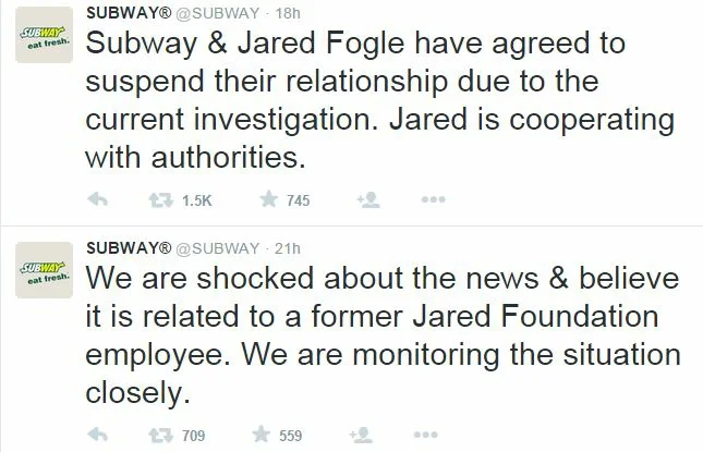 Subway isn't taking any chances. In a statement, the company said, "Jared continues to cooperate with authorities and he expects no actions to be forthcoming. Both Jared and Subway agree that this was the appropriate step to take."