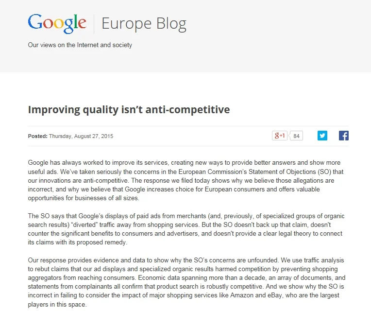 The first three paragraphs of the post, shown here, explain the European Commission's Statement of Objections (SO), including how Google ads shift users away from shopping on other websites.