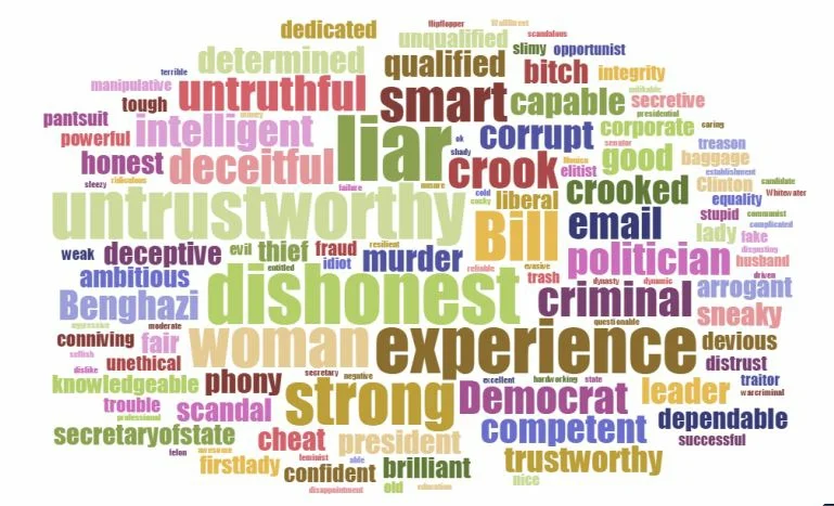 For republican candidate Donald Trump, the most common word association was "arrogant" and for Jeb Bush, it was "Bush," which could mean bad news if he's too closely associated with the family, particularly George W. Bush, not a very popular president. The word cloud shows mostly negative words for Clinton, and the one below, for Trump, isn't much more inspiring.