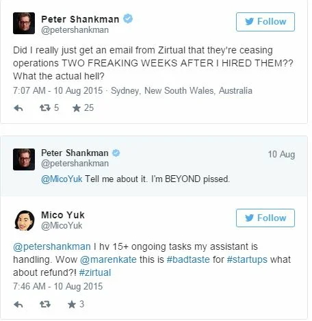 After starting business just 18 months ago, Zirtual has abruptly announced its demise. Customers and the 400 employees of the virtual personal assistant company were surprised and angry.