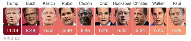 Donald Trump has been leading in the polls, and he was positioned in the center of the 10 candidates. Trump won the debate in terms of airtime with 11 minutes, 14 seconds.