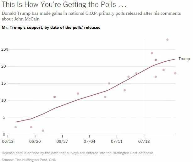 A New York Times article explains why Trump may still lead the Republican polls, although people are upset by the remark. One explanation is that poll reporting lags. We hear the results of polls days after they're taken. In the chart below, the article shows the results of Huffington Post and CNN polls as we saw them in the news, showing Trump's comments on July 18.