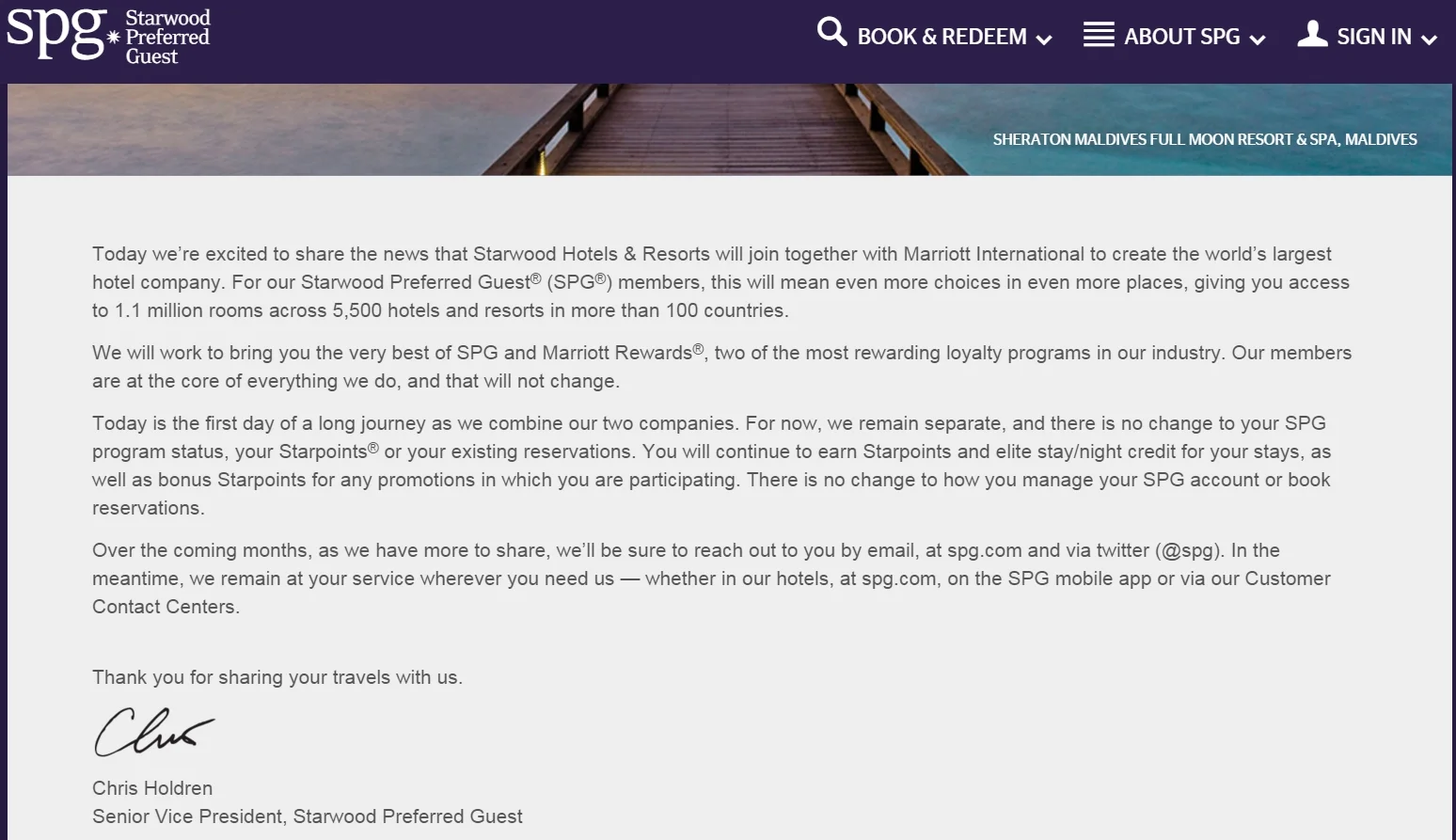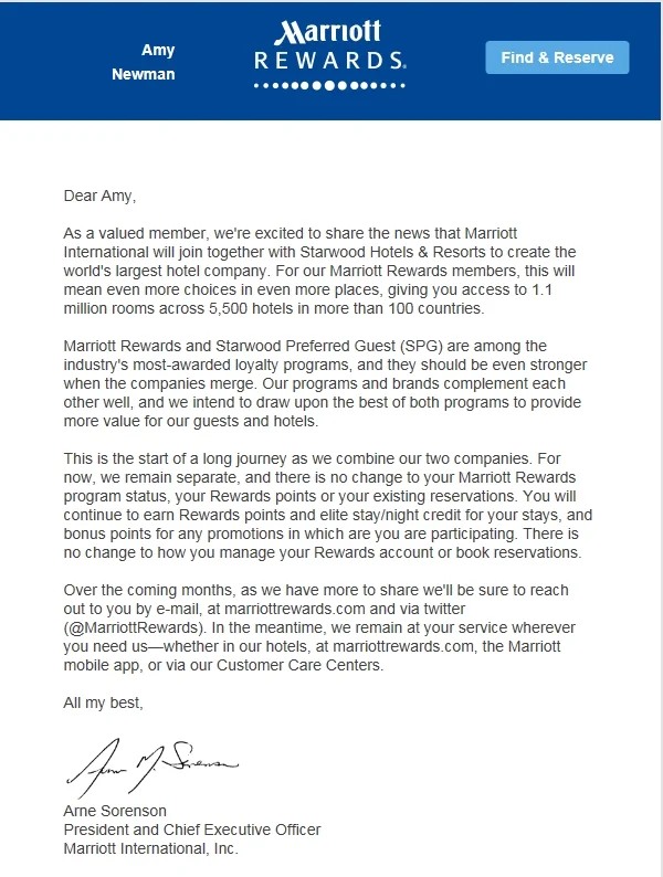 Marriott and Starwood clearly have coordinated communications to loyalty program members and employees. Three days after the news that Marriott is buying Starwood, Marriott Rewards Members received an email. A similar message was posted on Starwood's homepage for Starwood Preferred Guests (SPG members) on the day of the announcement. At the end of the Marriott message, which you can see here, is a LOT of boilerplate.