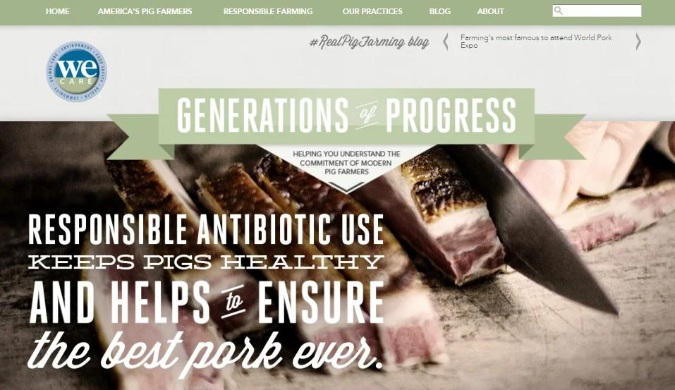 The Porkcares.org website highlights healthy practices for pig farming, particularly defending the use of antibiotics.