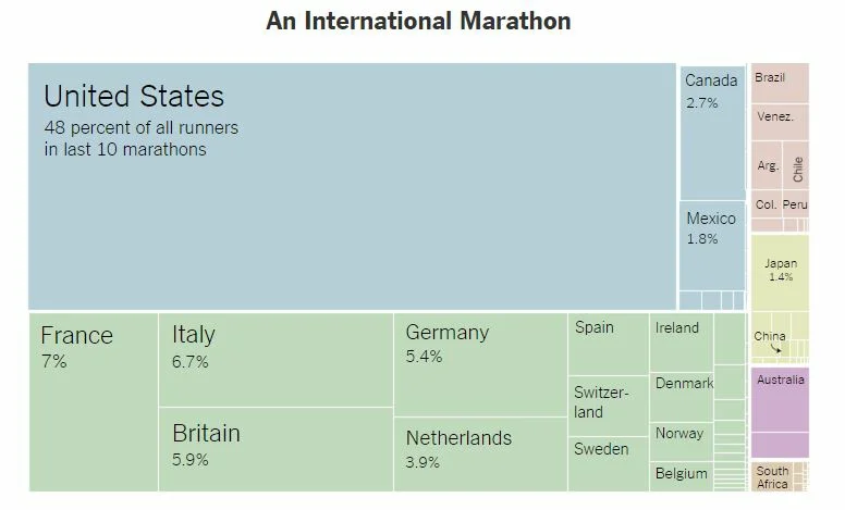 A New York Times article, "New York City Marathon in Six Charts," shows an interesting mix of line, bar, and other graphics. This one represents a newer way to display parts of a whole.