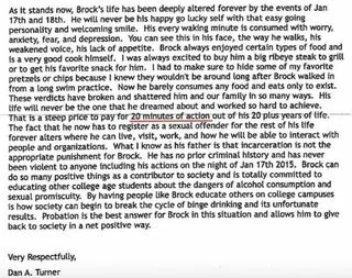 Turner's father didn't help his son or the public outrage with his defensive letter, including, "That is a steep price to pay for 20 minutes of action out of his 20 plus years of life." ThinkProgress calls the letter "impossibly offensive," and most people agree.