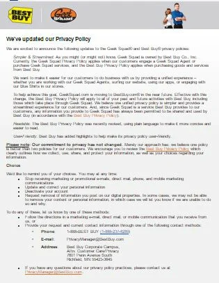 Geek Squad's email, with the subject line, "IMPORTANT NOTICE: We've updated our Privacy Policy," is a confusing mess. After reading the email, I have no idea what the changes are and why they're important to me.