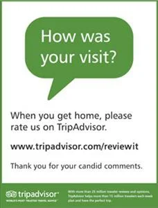 The image here encourages guests to write a review when they get home. Perhaps that's not the best strategy.