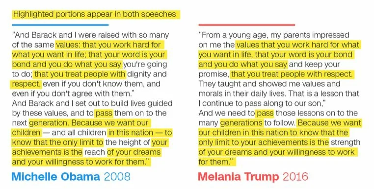 By any definition, Melania Trump's GOP Convention speech was plagiarized from Michelle Obama. The similarities between Donald Trump's wife's speech and Michelle Obama's 2008 DNC speech are uncanny. Here's one comparison from CNN, and other similarities exist: