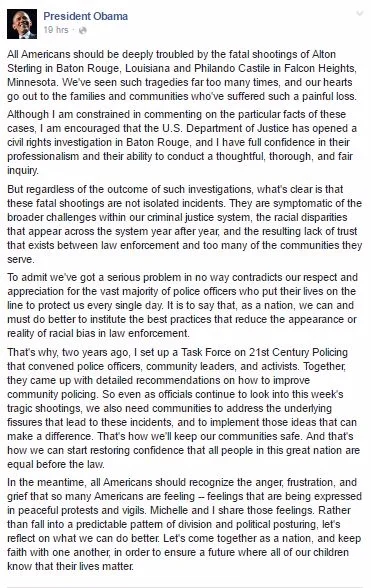 President Obama made a statement on Facebook and in video. After expressing condolences, he gave data showing "disparities in how African-Americans and Latinos are treated."