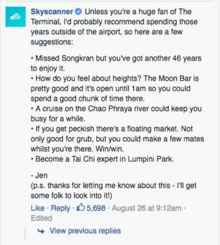 When Skyscanner travel app suggested a 47-year itinerary for a customer, he asked what he could do during the layover. Jen, the customer service rep didn't miss a beat: she's quick and fun, and includes her promise in the P.S.