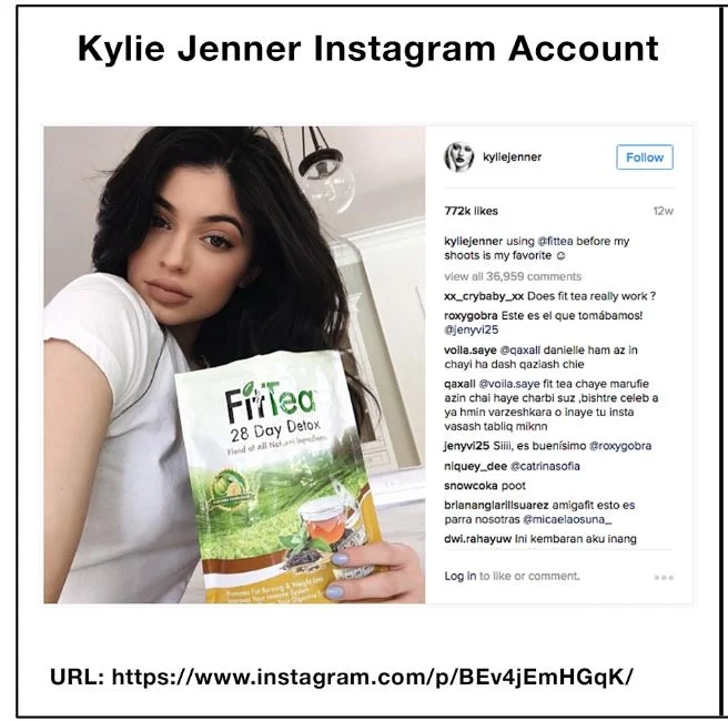 The organization Truth in Advertising wrote a letter to the Kardashian/Jenner family about recent posts they consider to be deceptive marketing. On her Instagram account, Kylie Jenner displays Fit Tea but fails to mention that this is a paid endorsement.