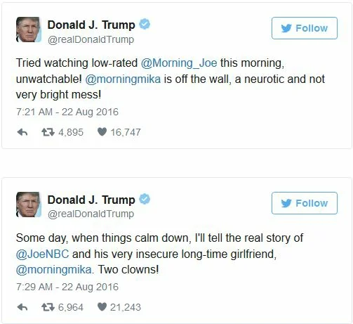 Now, Donald Trump is feuding with the hosts of MSNBC's Morning Joe, Mika Brzezinski and Joe Scarborough. Earlier this month, Scarborough wrote a scathing piece in The Washington Post, "The GOP Must Dump Trump." He ended by encouraging Republicans to withdraw their support and find a new candidate: