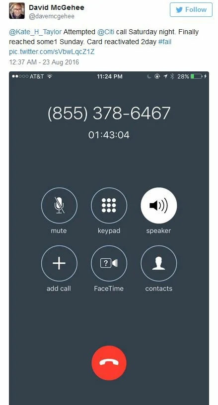 Today, customers still have trouble getting through to the call center, and the situation has worsened. One customer posted a screenshot of his phone showing a call that lasted 1 hour and 43 minutes. Others complained that they received an incorrect card or none at all, and automatic payments were stopped.