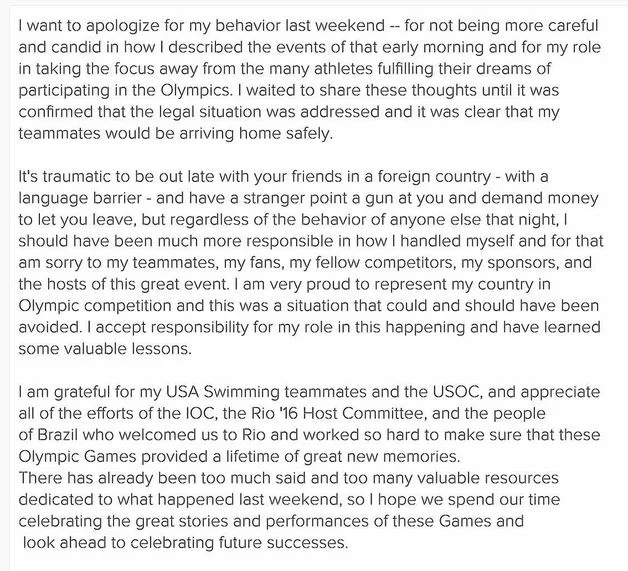 Lochte's statement hasn't satisfied many people. Quoted in The New York Times, sports commentator Rodrigo Mattos said, "Lochte apologizes but doesn't admit lying. He's still portraying himself as a victim. So much arrogance."