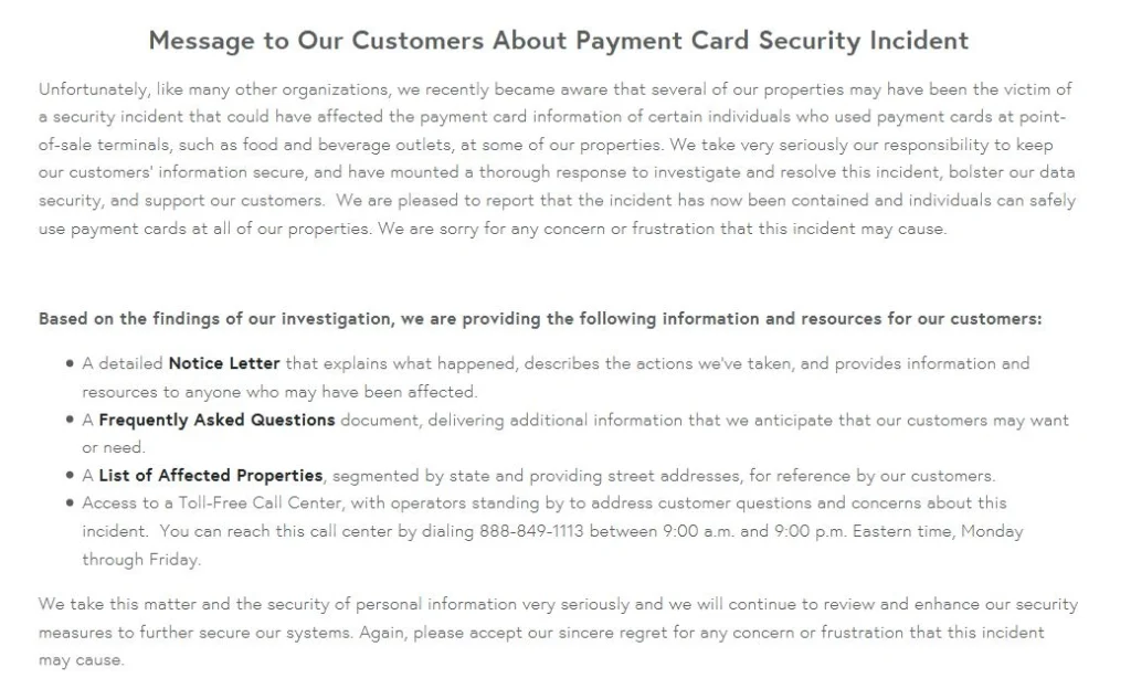 Individual hotels don't seem to be communicating much; for example, the Boca Raton Marriott and Westin Philadelphia websites aren't displaying the typical breach notices. These brands may be smart to leave the trouble with HEI.