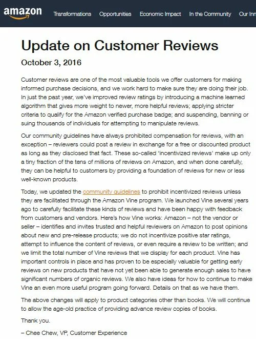Amazon will continue its Vine program, which encourages reviews but doesn't have the same reward system: