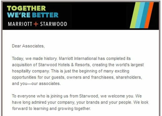 The deal is finally done: Marriott and Starwood are one company. Starwood associates received this message from Marriott Communications under the subject line, "A Historic Moment: Marriott + Starwood Merger Complete." The message continues, highlighting the combined company's impressive portfolio of brands and properties. Associates are also invited to find out more on a "new integration site" called "The Platform."