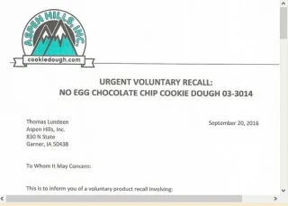 "BLUE BELL ICE CREAM RECALLS SELECT PRODUCTS CONTAINING CHOCOLATE CHIP COOKIE DOUGH PIECES PURCHASED FROM OUTSIDE SUPPLIER ASPEN HILLS DUE TO POSSIBLE HEALTH RISK"