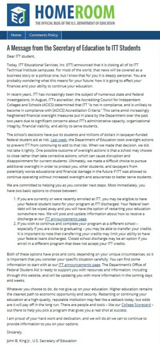 U.S. Education Department Secretary John B. King Jr. said, "The school's decisions have put its students and millions of dollars in taxpayer-funded federal student aid at risk." He explained the Department's perspective and provided resources to students in a blog post, shown here. Students also can participate in a webinar to learn more.