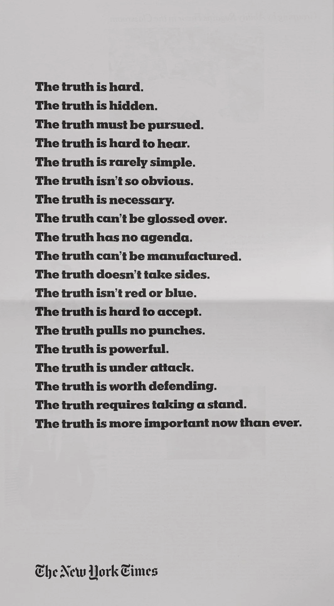 An executive on the ad agency team, Droga5, said, "the truth is hard . . . It doesn't matter what side of the spectrum you're on politically." The ad comes in the midst of President Trump's criticism of the media as "fake news" and "an enemy of the American People!"