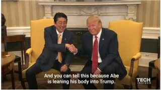 Business Insider asked Dr. Lillian Glass, a self-described body language expert to analyze President Trump's body language. She says Trump's "robust" handshake with the prime minister of Japan communicates, "Hey, we get along. I really like you." She says the PM's body language communicates the same and says that Trump's "cupping" his hand (placing his hand over the prime minister's) also indicates affection.