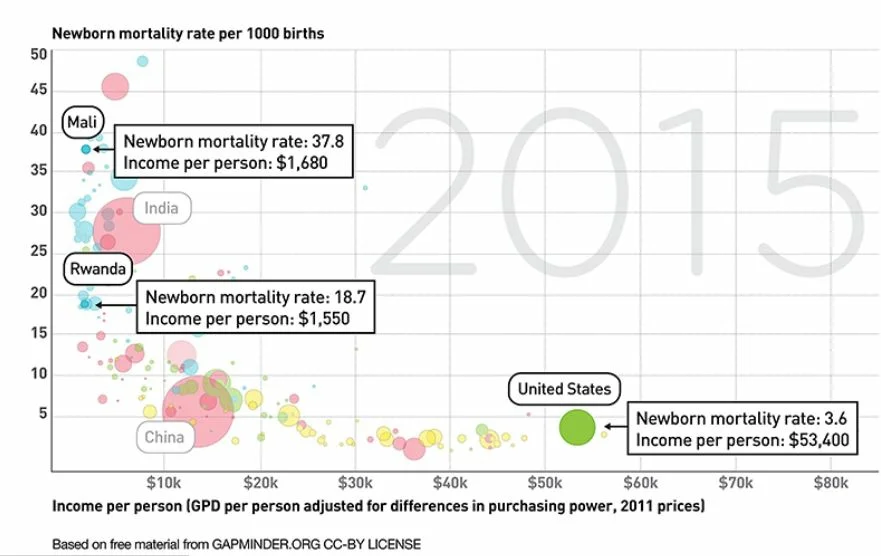 With quotes from Melinda and Bill, the report includes progress on fighting disease and many charts to show declines in mortality rates around the world. We see such a rich variety of chart types: bar, pie, line, area, and area. In addition, the letter includes a table, photos, videos, and a wonderful bubble chart from Gapminder.org, founded by the recently deceased data visualization pro Hans Rosling.