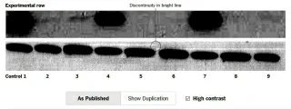 In a nifty, interactive visual, The New York Times shows how Croce's work was manipulated in one journal article. If you look closely, you see that a bright line is disjointed, warning that some copying and pasting took place. Indeed, samples 6, 7, and 8 are identical to 3, 4, and 5.