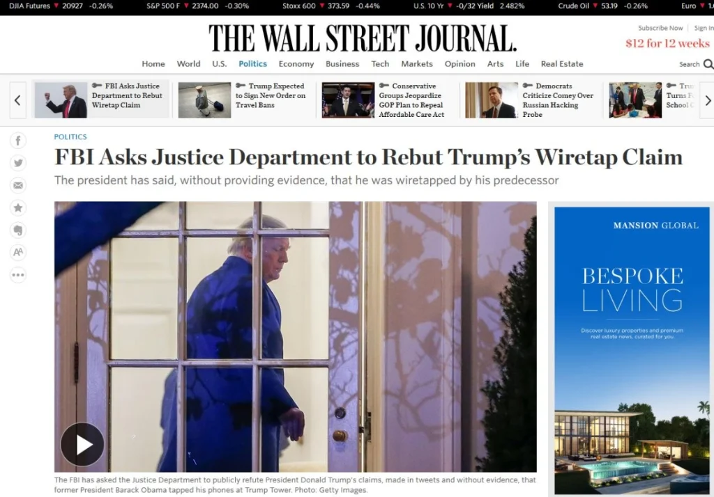 I sometimes compare headlines in The New York Times and The Wall Street Journal. Today, they are both running this story as front page news, and even the more conservative WSJ says President Trump made this claim without evidence. The subtitle reads, "The president has said, without providing evidence, that he was wiretapped by his predecessor."