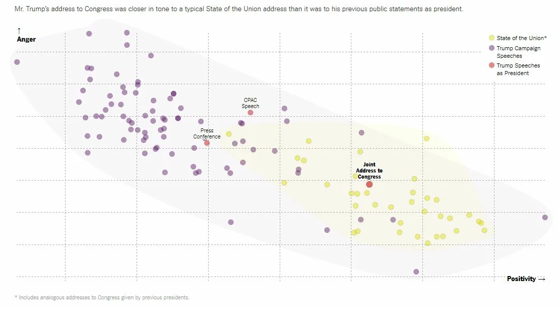How would you describe Trump's tone in his speeches? A New York Times article explains how sentiment analysis was used to compare his speeches over time and to other State of the Union addresses: