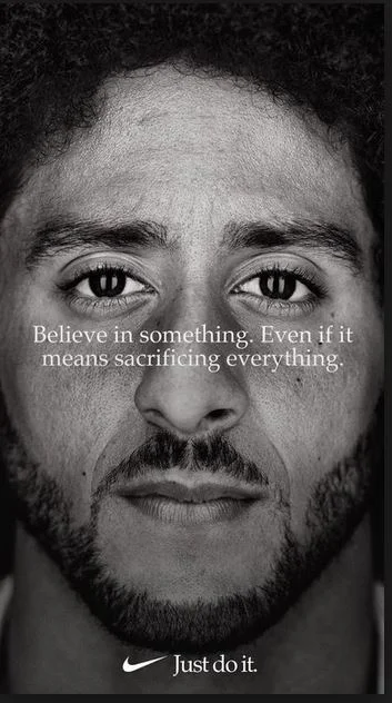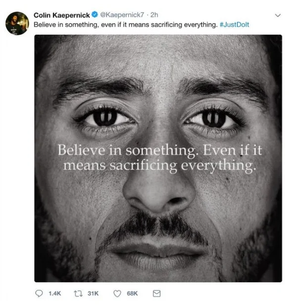 But neither Nike nor Kaepernick are shying away from the message. The first ad shows Kaepernick with the caption, "Believe in something. Even if it means sacrificing everything."
