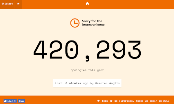 Great Western Railway is tripping over itself apologizing for thousands of canceled and late trains. Apologies by British train organizations are so common that a web designer created a site, https://www.sorryfortheinconvenience.co.uk, to chronicle statements, now totaling more than 420,000.