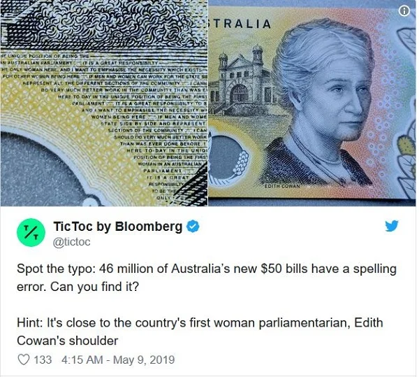 On the front of the bill, we see a picture of Edith Cowan, who was a social reformer and Australia’s first female parliamentarian. Near her shoulder, we also see a transcript of her first speech to the the Western Australian Parliament. In tiny print, but clear when it’s enlarged, is a misspelling of “responsibility,” missing the third “i.” The bills were in circulation for about six months before discovered by a radio station.
