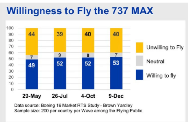The documents give us an inside view of how the company plans to use persuasive strategies to win back customers. In one graphic, we see customers’ willingness to fly. In another, we see customer concerns and ways Boeing can address them, for example, with FAQ cards, “pilot confidence videos,” or personal connections (for example, “Flight attendant offers comfort and information on the safety of the MAX”).