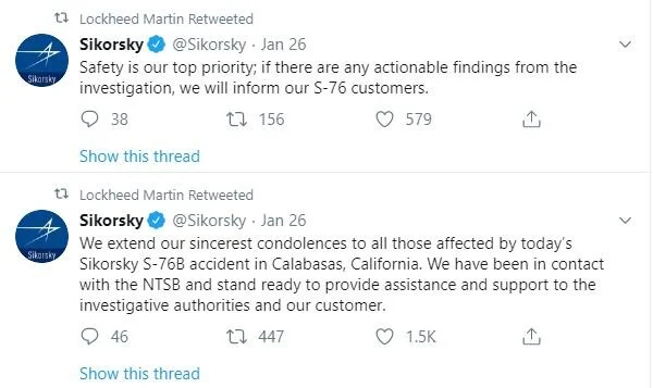 The helicopter company, Sikorsky, owned by Lockheed Martin, posted two tweets and a short statement on its website:
