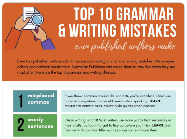 An editor at Macmillan Publishing created an infographic to show the most common mistakes writers make. Misplaced commas, wordy sentences, and run-on sentences get top billing.