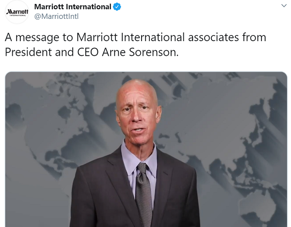 A Forbes article calls him an “authentic leader” and applauds his video about the business. Marriott CEO Arne Sorenson begins by talking about his appearance: he is undergoing treatment for pancreatic cancer.