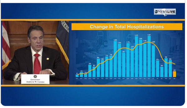When he shows this chart, Governor Cuomo describes, the decreasing numbers of new hospitalizations. The chart title is clear: “Change in Total Hospitalizations.” But what does the visual imply?